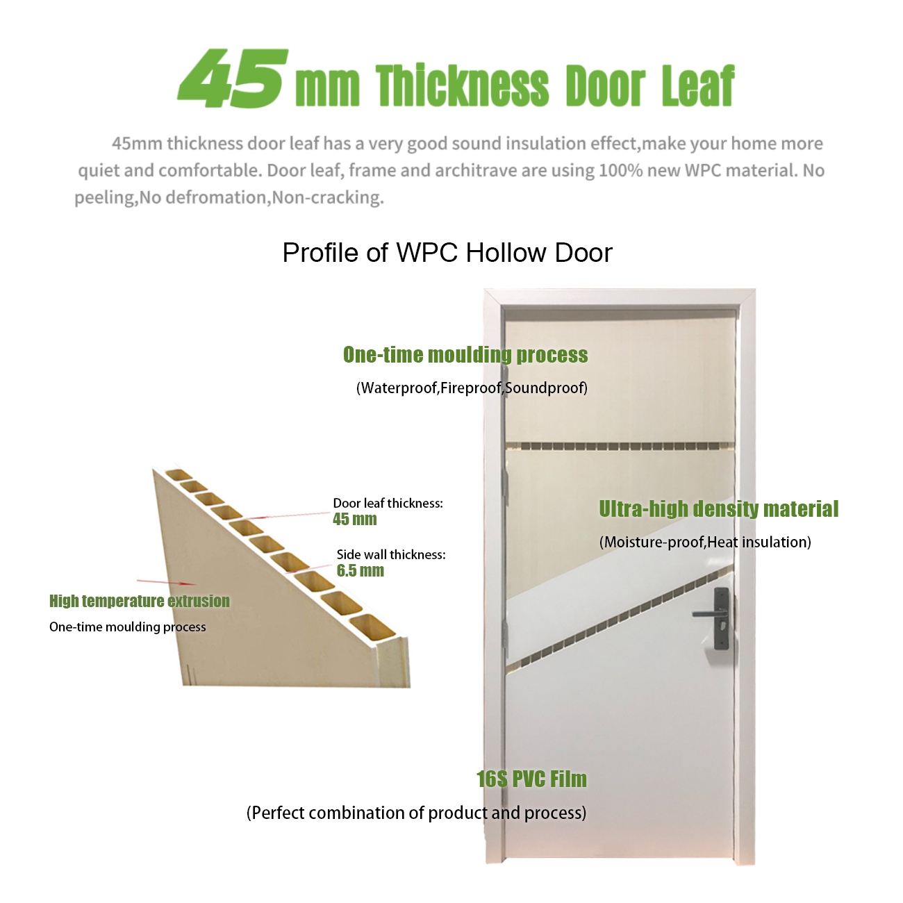 WPC door panels width up to 1100mm, height up to 2700mm, thickness 45mm, board thickness options of 4.5mm, 5mm, and 6.5mm.